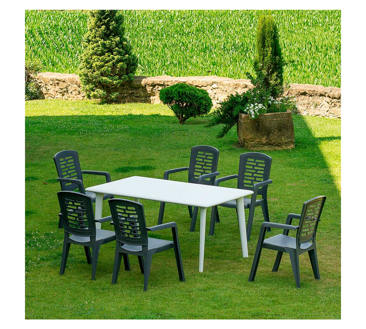 Sillón para uso exterior. Apilable. Inyectado en polipropileno. Peso neto 3,22 kg. Protección UV. Acabado texturizado mate. H 91 cm W 58 cm L 63 cm Color: Blanco